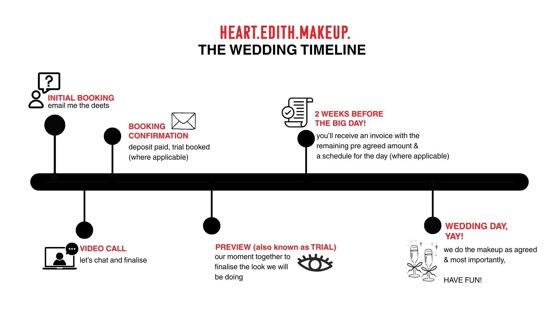 Once we agreed to go ahead, I’ll send you a booking confirmation. Attached you’ll find all the details discussed, my T&Cs and a deposit invoice (pre-agreed). Paying the deposit fee means you have agreed to the T&Cs and booking will only be secured once the fee is paid.
